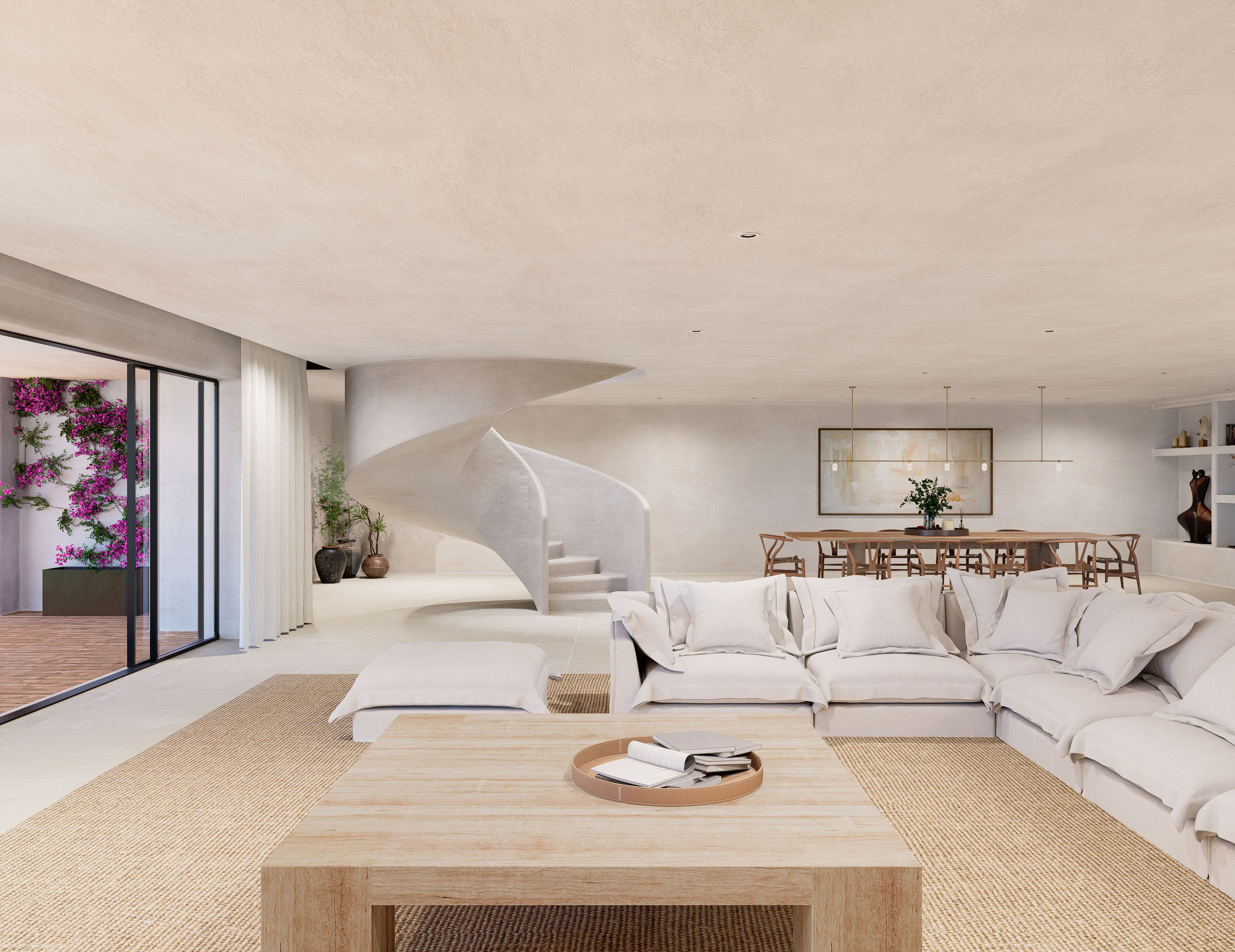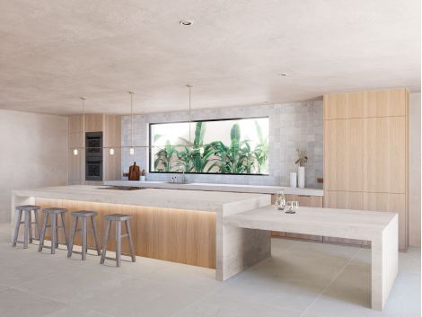 Open-plan kitchen connected to stylish living and dining areas